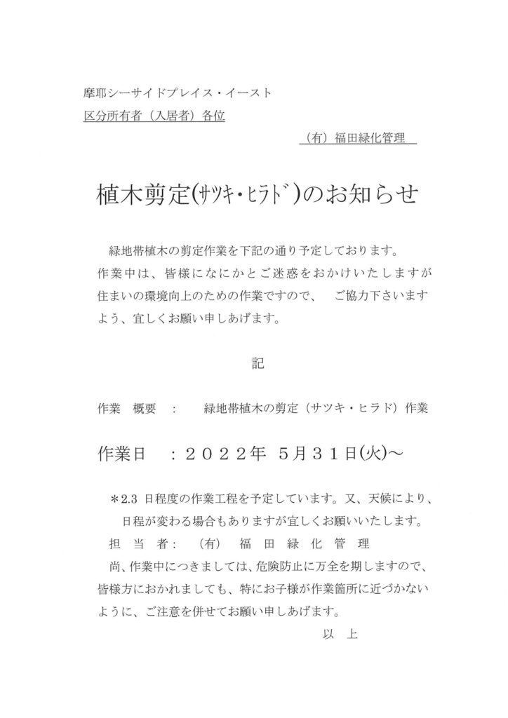 植木剪定(サツキ・ヒラド)のお知らせ