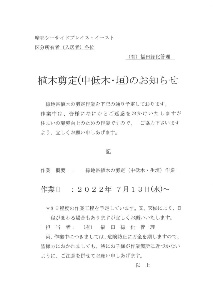 植木選定(中低木・垣)のお知らせ
