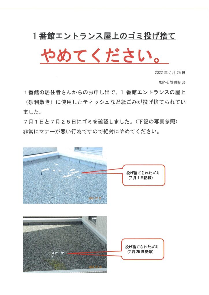 1番館エントランス屋上のゴミ投げ捨て