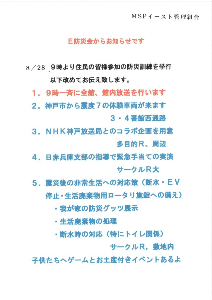 8月28日(日)9:00~MSP-E防災訓練