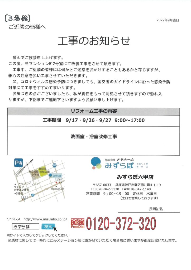 住民ページ > お知らせ掲示板 > 住民-お知らせ > [3番館]リフォーム工事のお知らせ