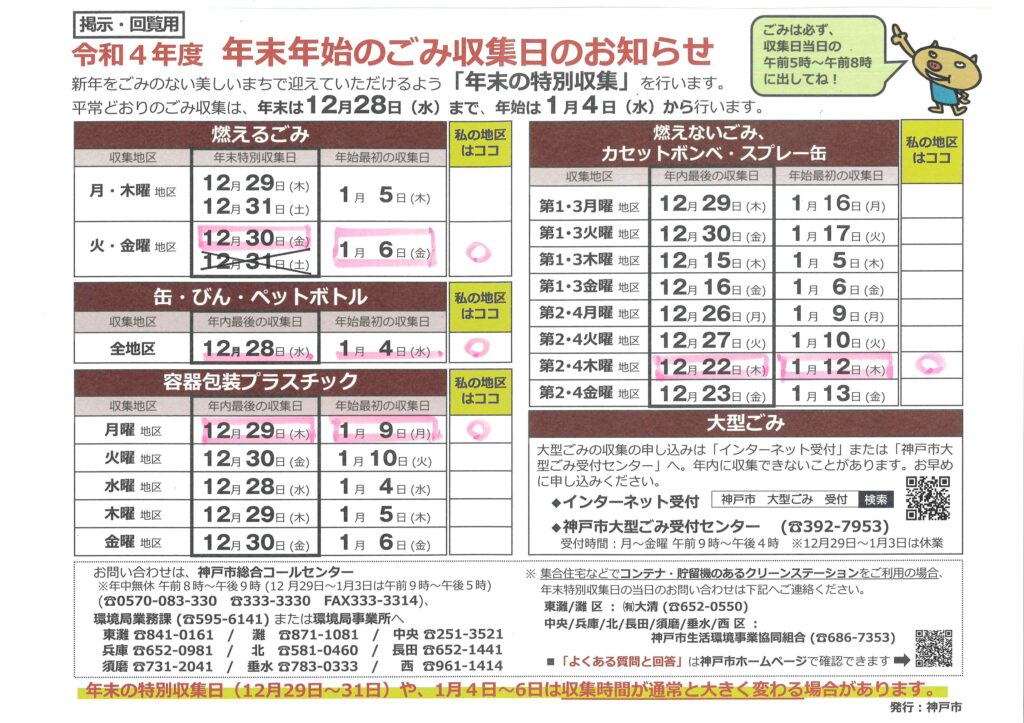 住民ページ > お知らせ掲示板 > 住民-お知らせ > 令和4年度 年末年始のごみ収集日のお知らせ