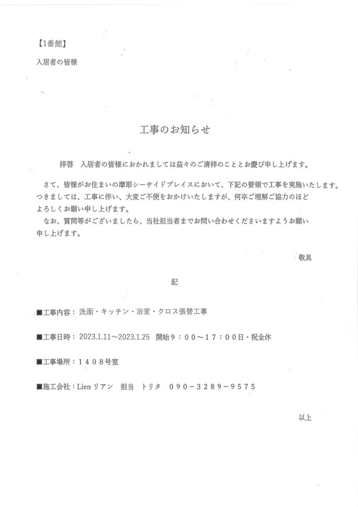 [1番館]リフォーム工事のお知らせ