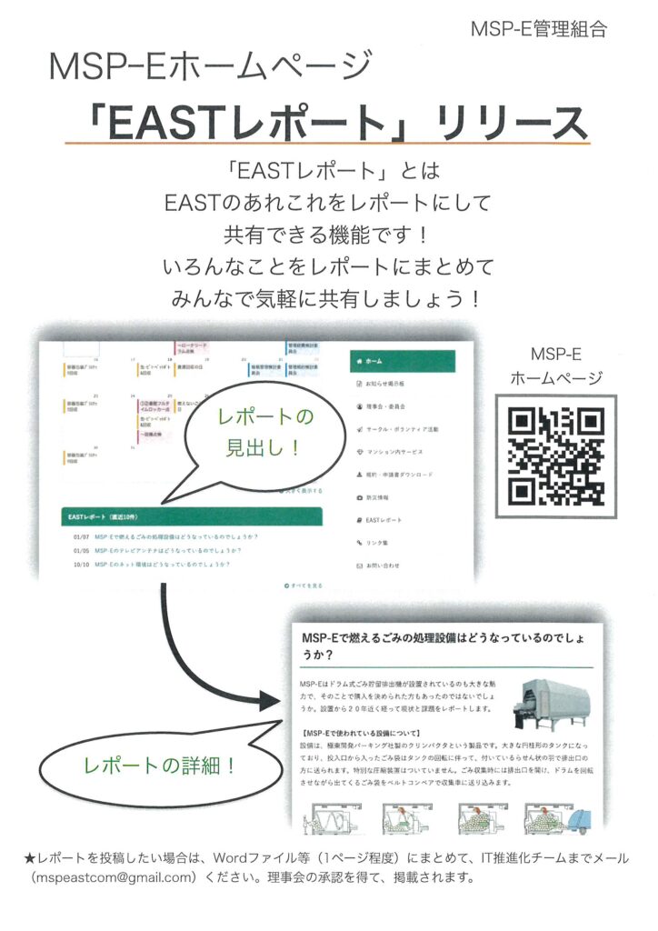 住民ページ > お知らせ掲示板 > 住民-お知らせ > MSP-Eホームページ「EASTレポート」リリース