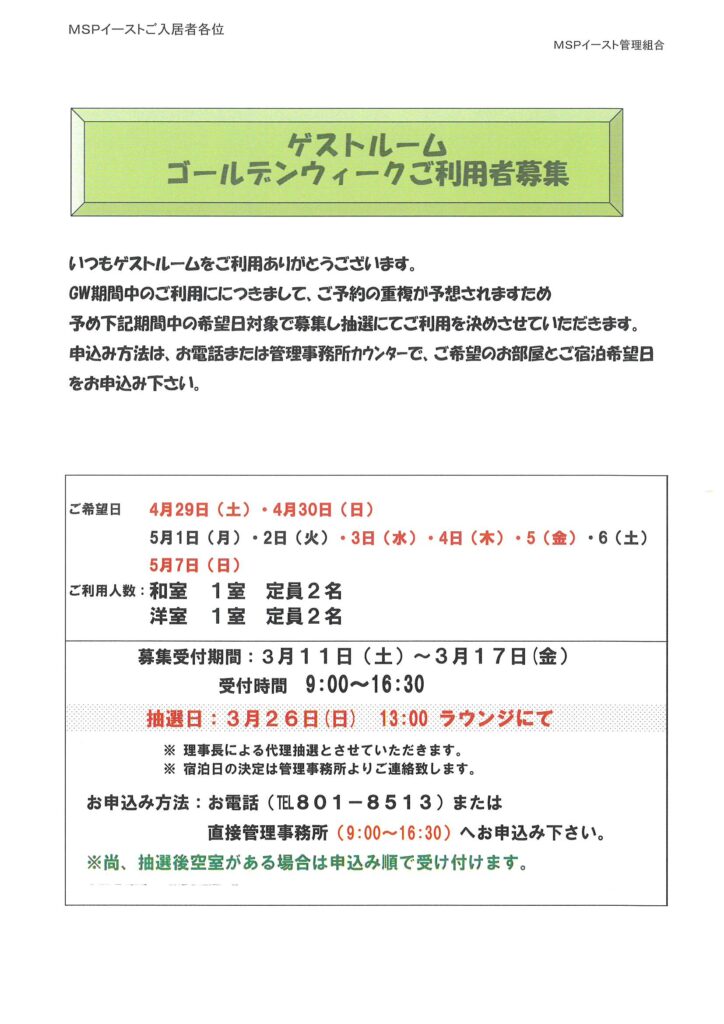 ゲストルームG.Wご利用者募集