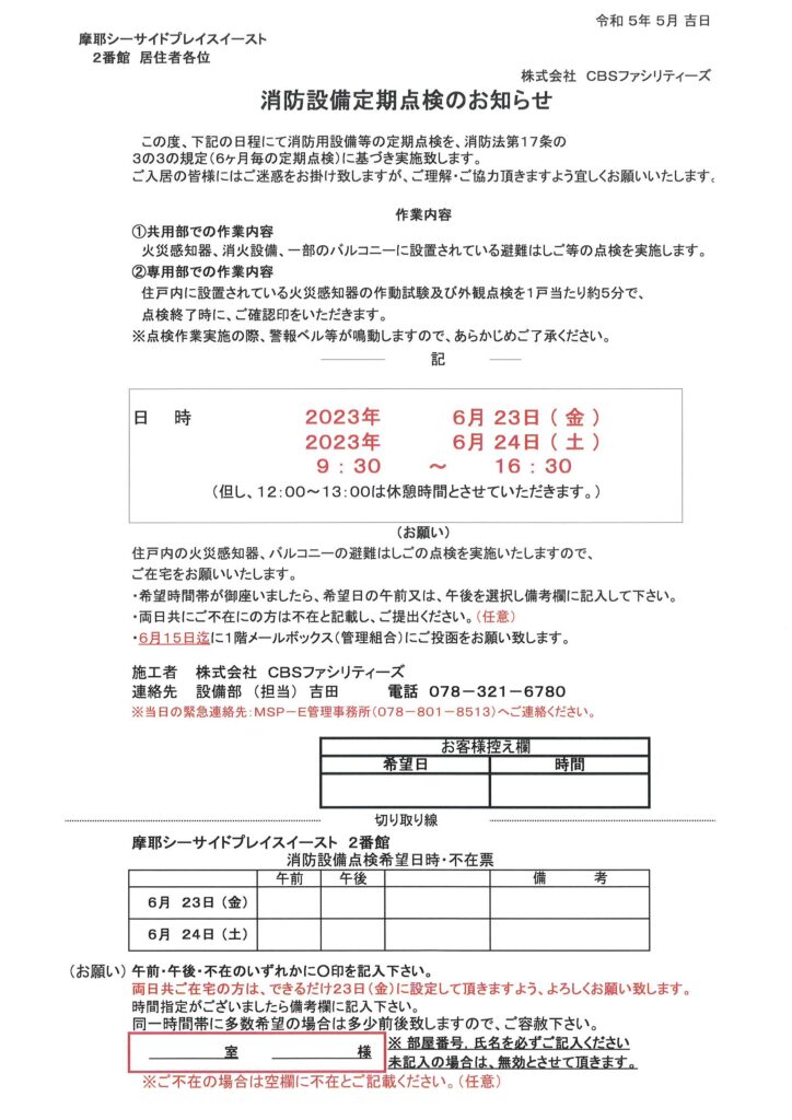 住民ページ > お知らせ掲示板 > 住民-お知らせ > 6月21日~24日消防設備点検のお知らせ