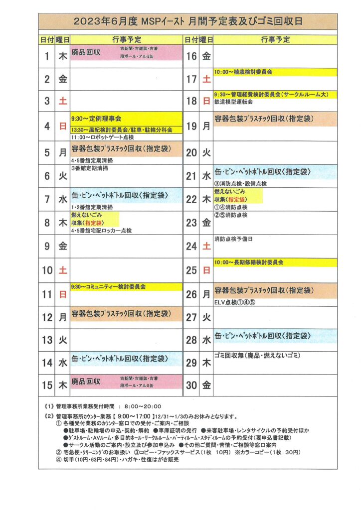 2023年6月度MSP-E月間予定表及びゴミ回収日