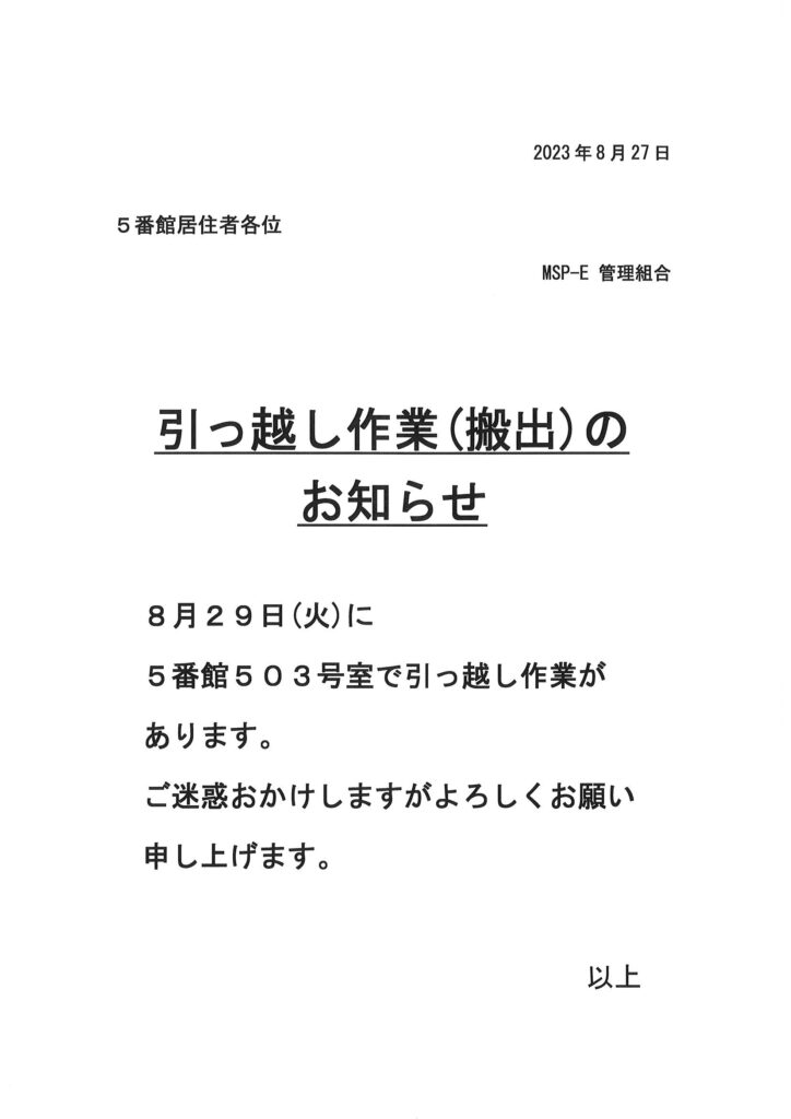 [5番館]引っ越し作業のお知らせ