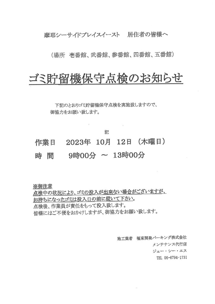 10/12(木)ゴミ貯留機保守点検のお知らせ