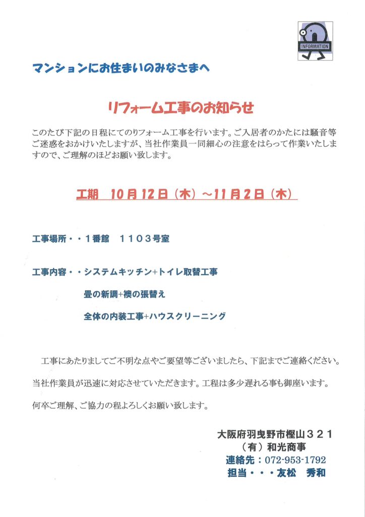 [1番館]リフォーム工事のお知らせ