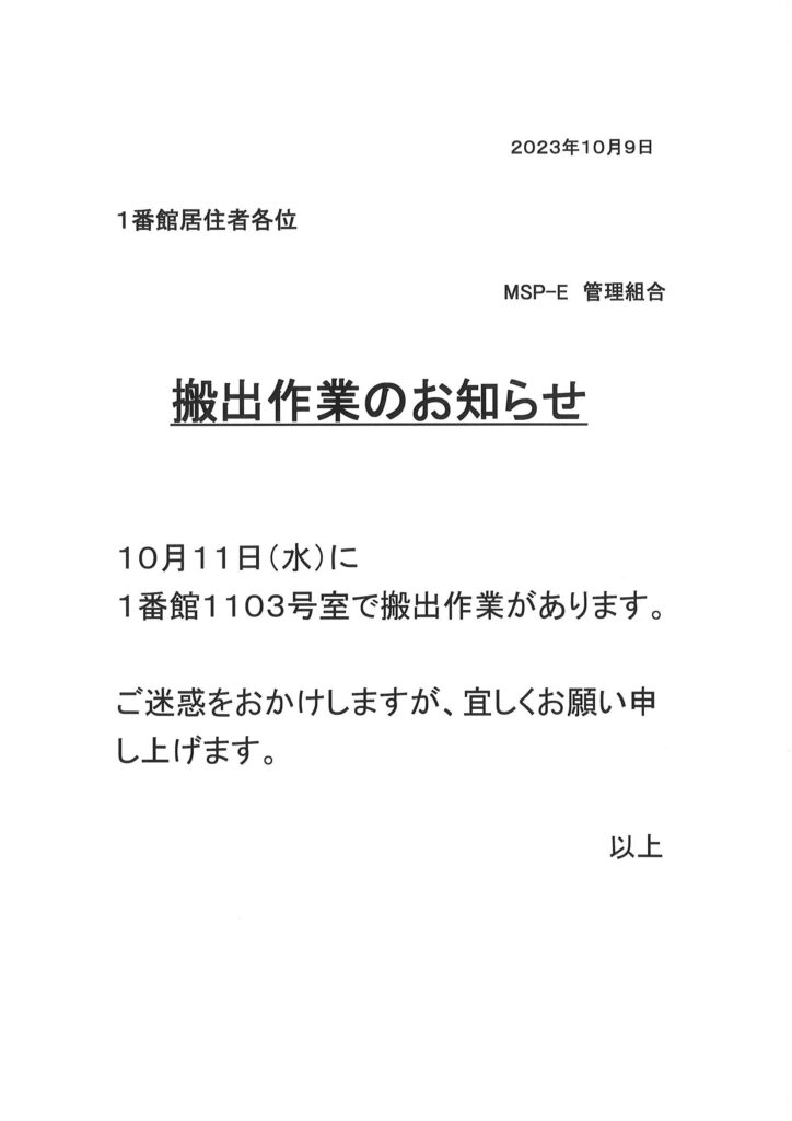 住民ページ > お知らせ掲示板 > 住民-お知らせ > [1番館]搬出作業のお知らせ