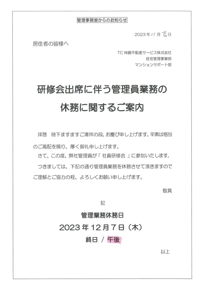 住民ページ > お知らせ掲示板 > 住民-お知らせ > 研修会出席に伴う管理員業務の休務に関するご案内
