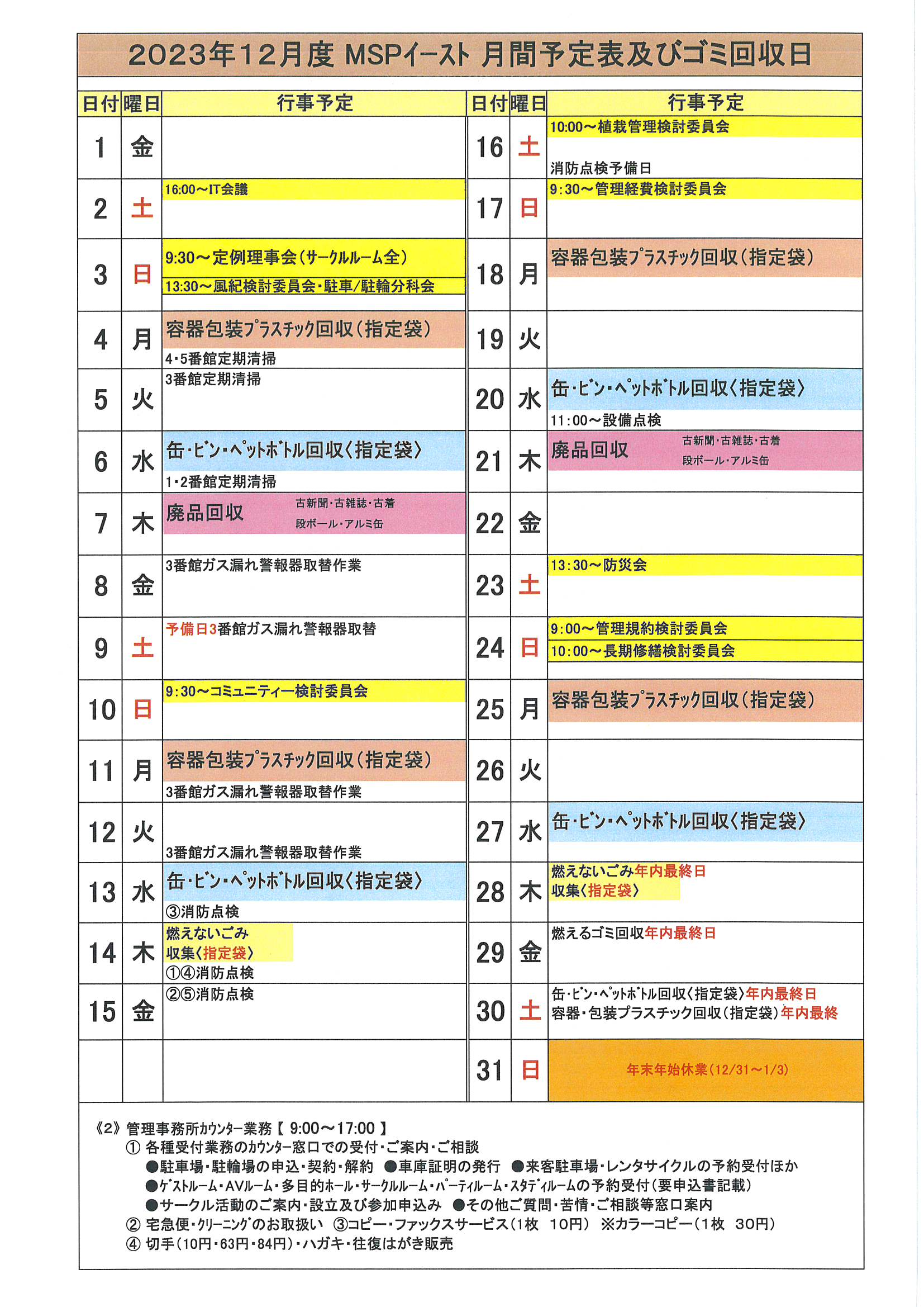 2023年12月度MSP-E月間予定表及びゴミ回収日