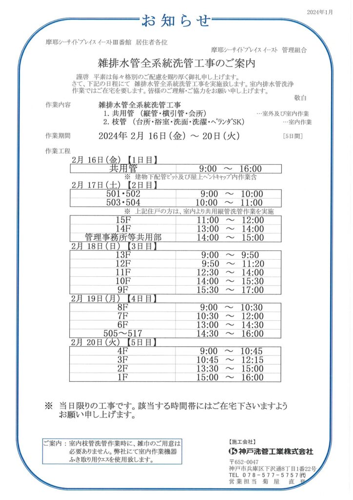 3番館雑排水管洗管のお知らせ(2/16~2/20)
