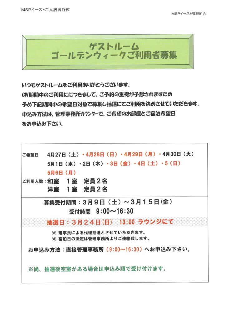 住民ページ > お知らせ掲示板 > 住民-お知らせ > ゲストルームG.Wご利用者募集