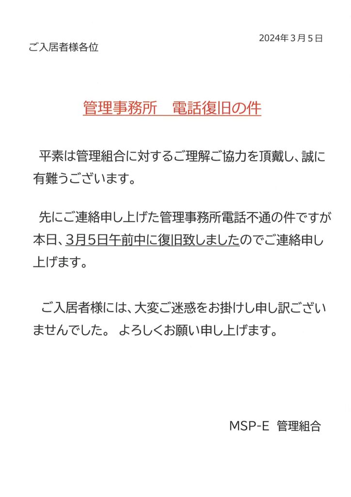 管理事務所 電話復旧の件