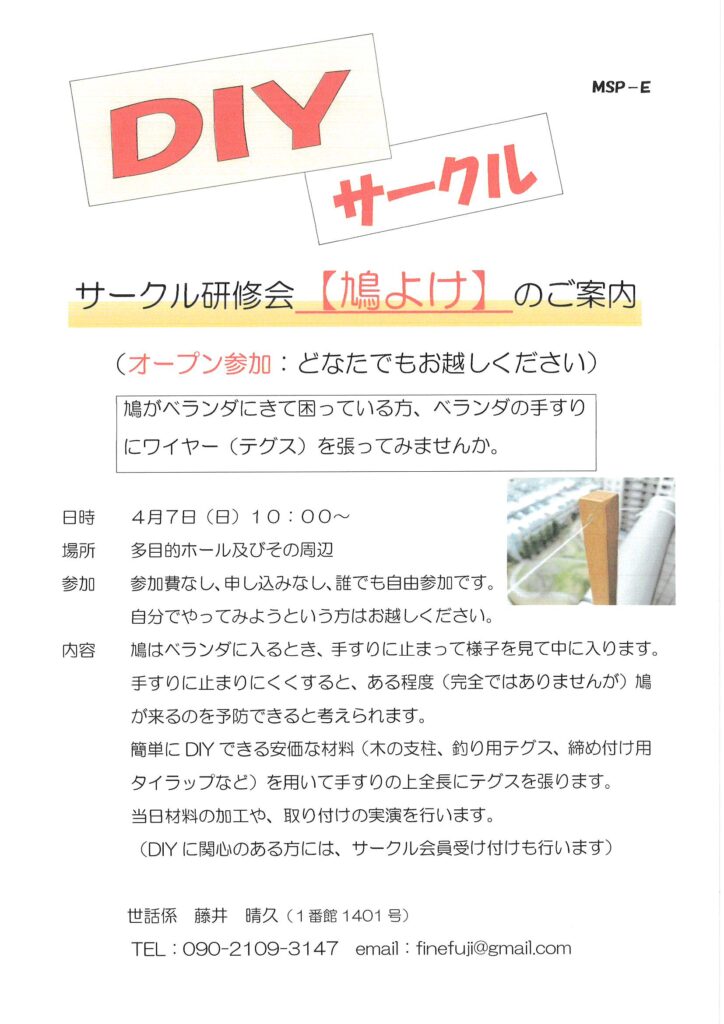 住民ページ > お知らせ掲示板 > 住民-お知らせ > 4/7(日)DIYサークル研修会