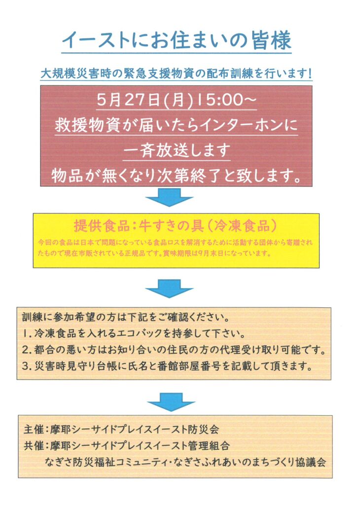 5月27日(月)15:00~大規模火災時の緊急支援物資の配布訓練を行います
