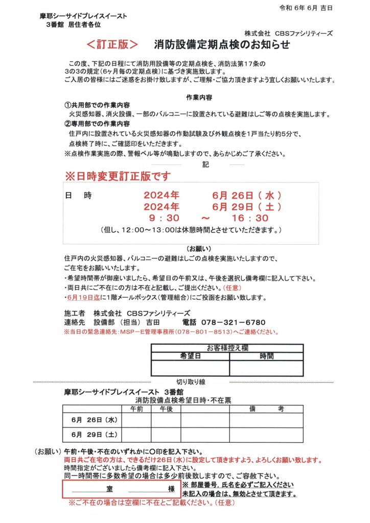 【3番館/訂正版 消防設備定期点検のお知らせ】