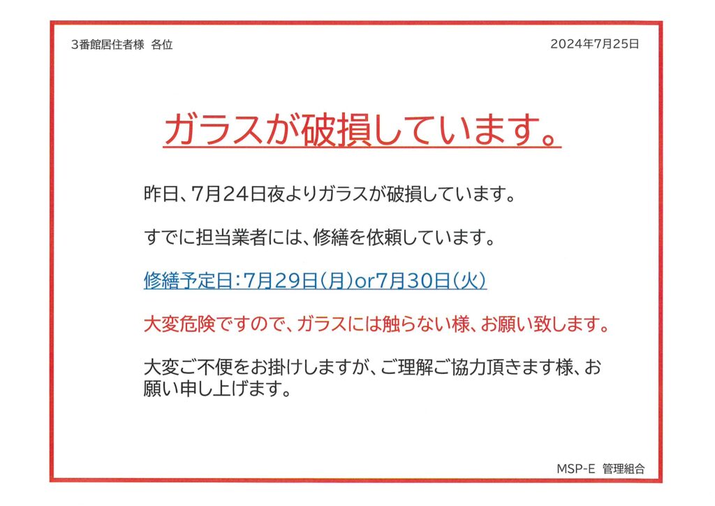 住民ページ > お知らせ掲示板 > 住民-お知らせ > 3番館・ガラスが破損しています