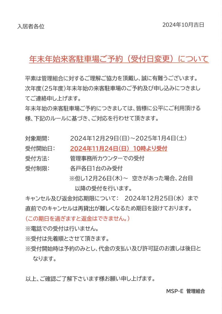 年末年始来客駐車場ご予約(受付日変更)について