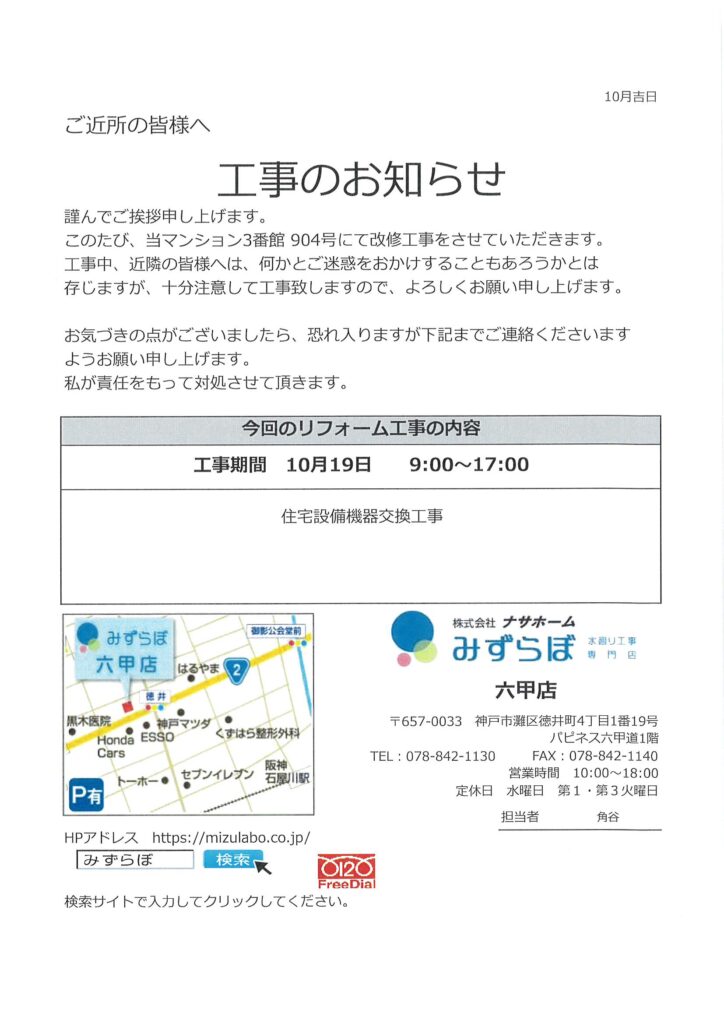 住民ページ > お知らせ掲示板 > 住民-お知らせ > [3番館]リフォーム工事のお知らせ