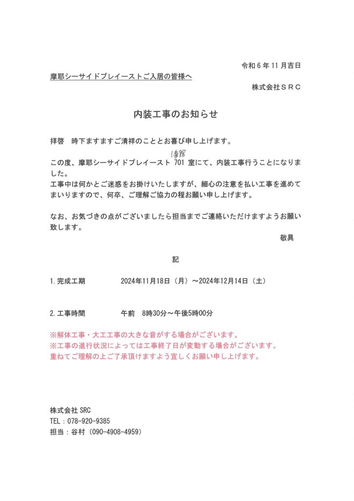 [1番館]リフォーム工事のお知らせ
