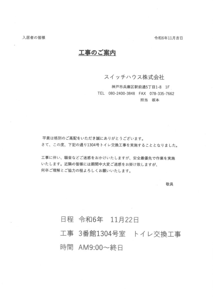 [3番館]リフォーム工事のお知らせ
