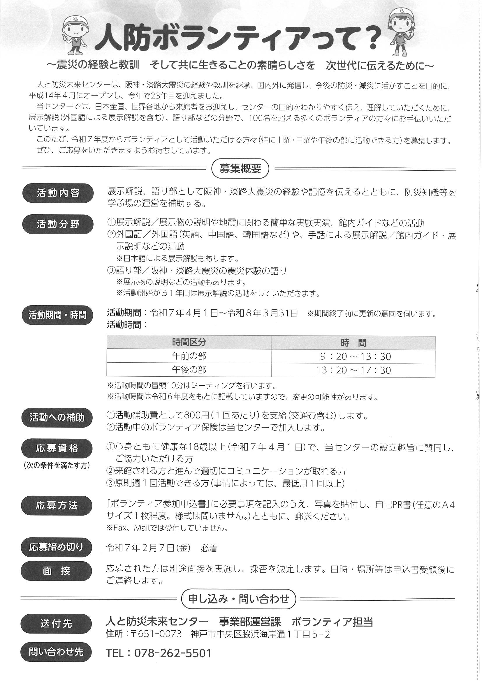 住民ページ > お知らせ掲示板 > 公開-お知らせ > 人と防災未来センター/ボランティア募集!!