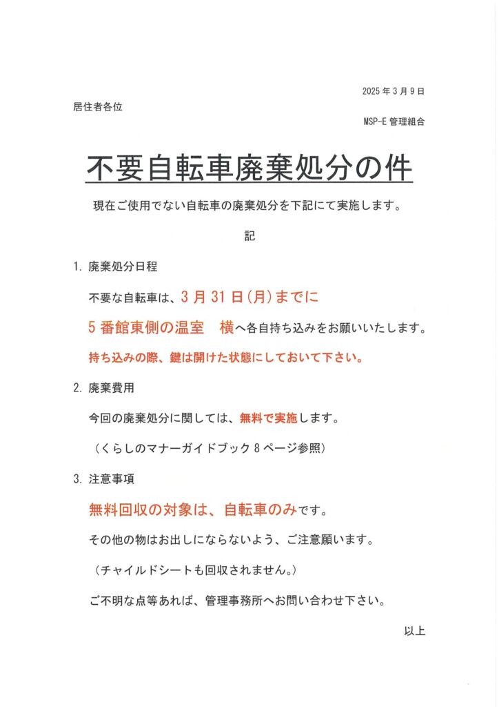 住民ページ > お知らせ掲示板 > 住民-お知らせ > 不要自転車廃棄処分の件