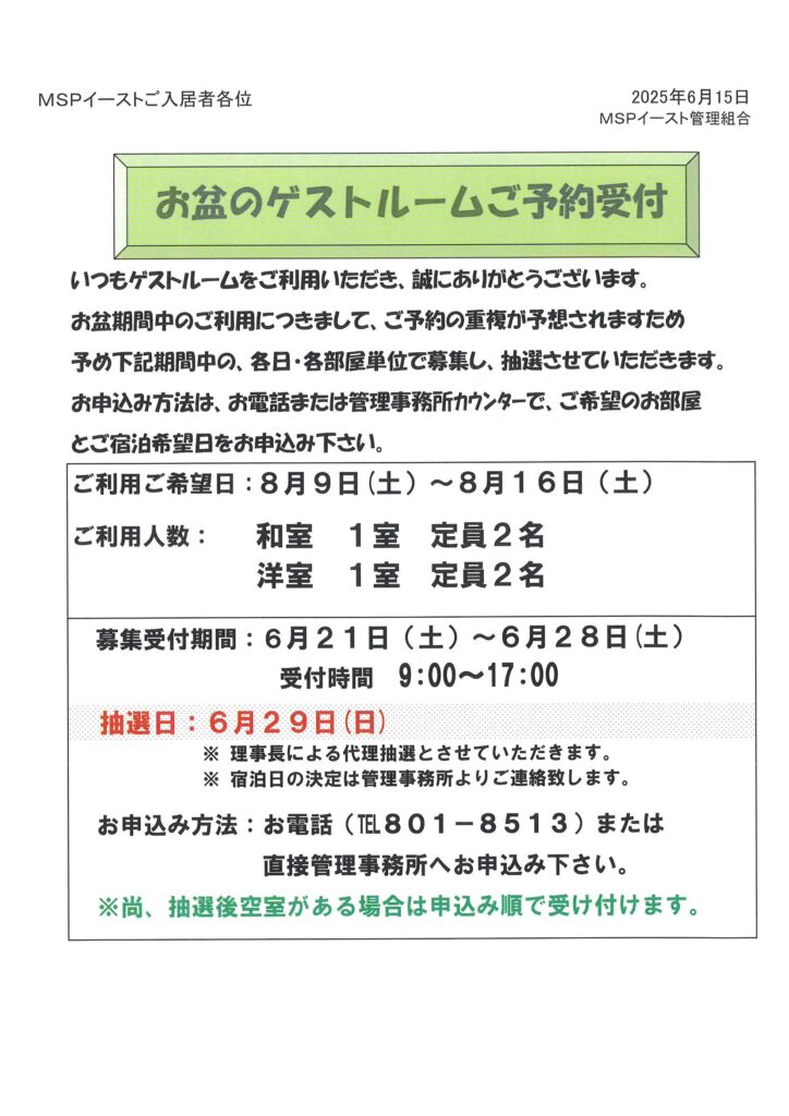 住民ページ > お知らせ掲示板 > 住民-お知らせ > お盆のゲストルームご予約受付