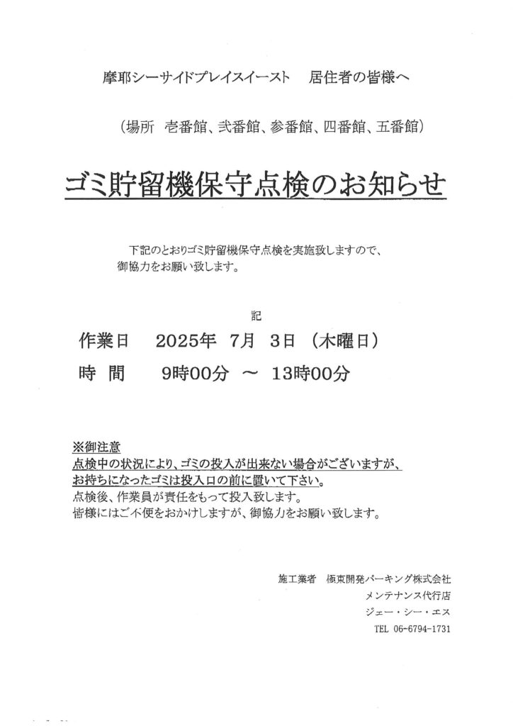 7月3日(木)ゴミ貯留機保守点検のお知らせ