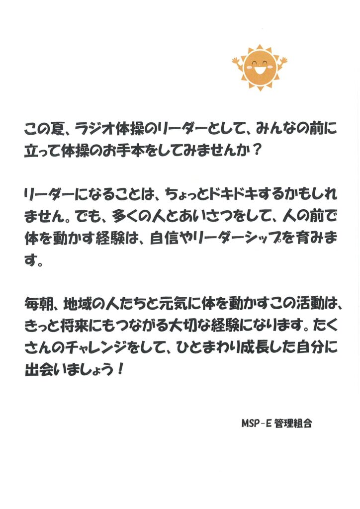 住民ページ > お知らせ掲示板 > 住民-お知らせ > 夏休みラジオ体操 リーダー募集