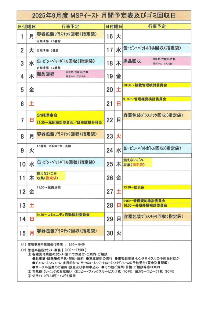 2025年9月度MSPイースト月間予定表及びゴミ回収日