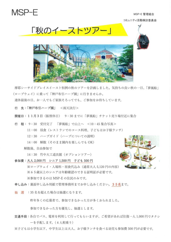 住民ページ > お知らせ掲示板 > 住民-お知らせ > 11/3「秋のイーストツアー」