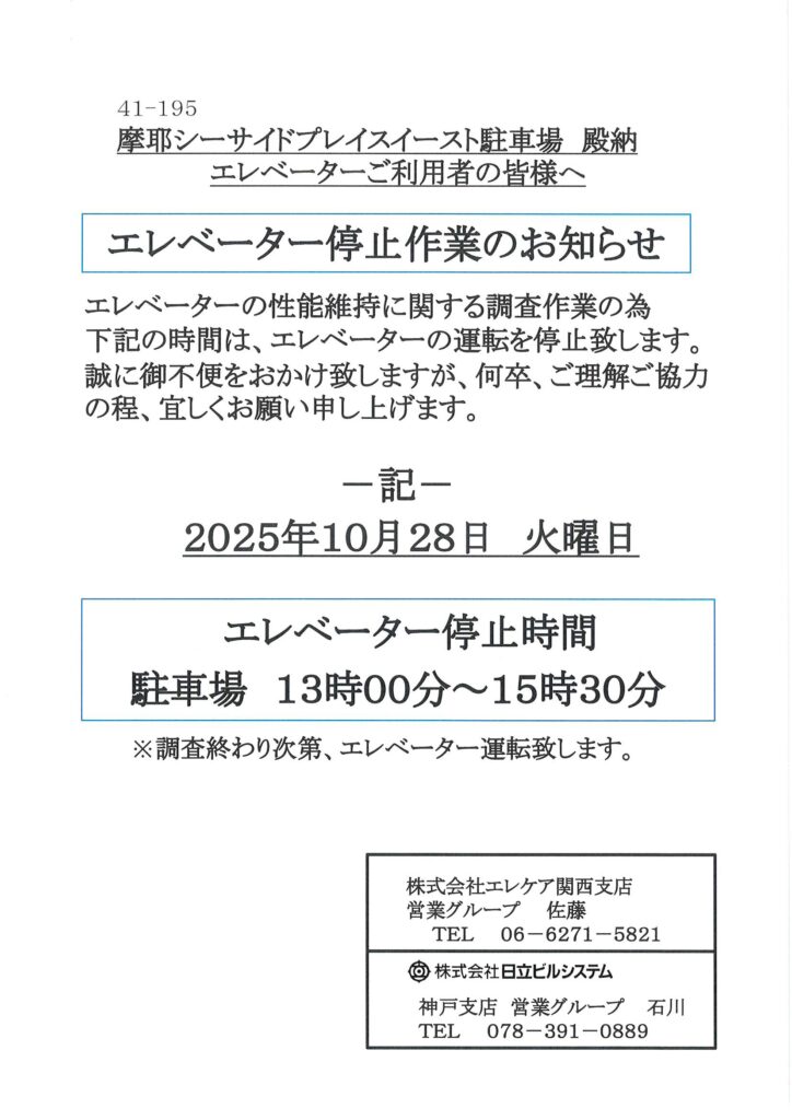 [自走駐]エレベーター停止作業のお知らせ