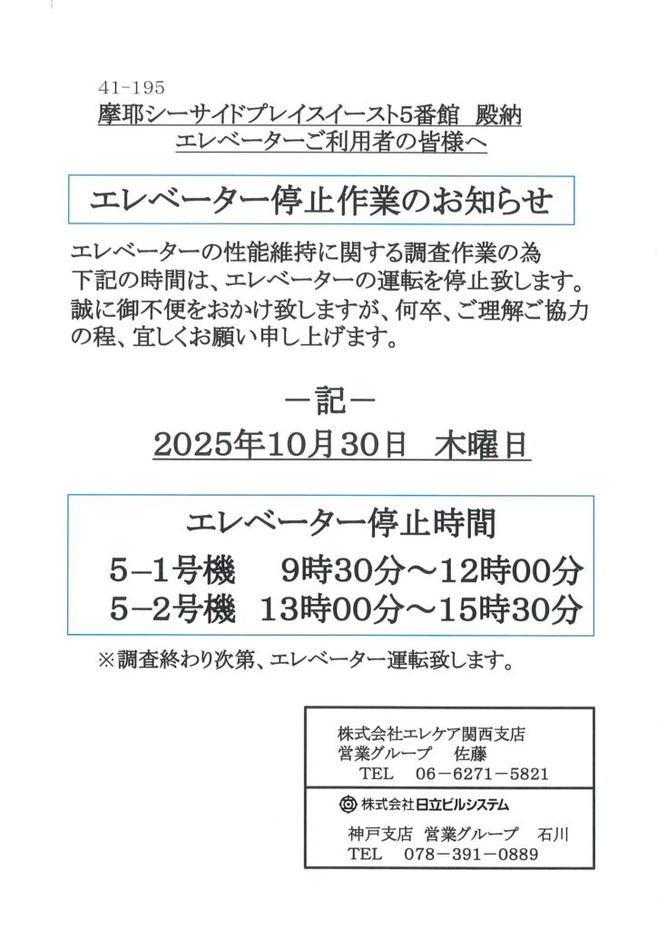 [5番館]エレベーター停止作業のお知らせ