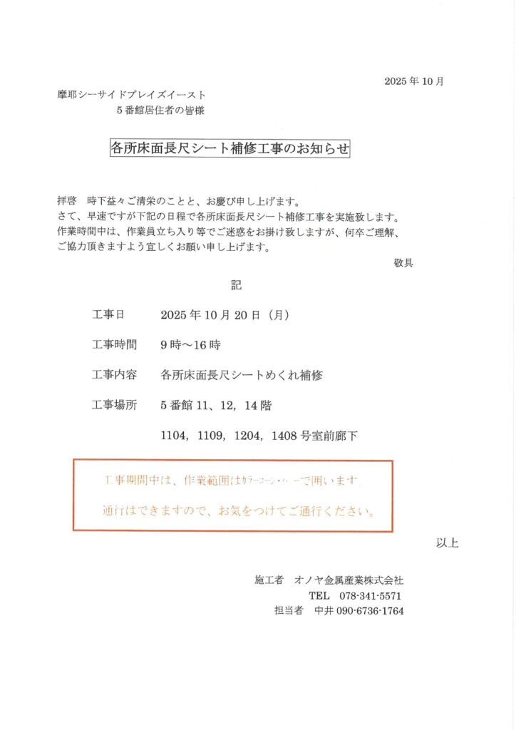 住民ページ > お知らせ掲示板 > 住民-お知らせ > [5番館]各所床長尺シート補修工事のお知らせ