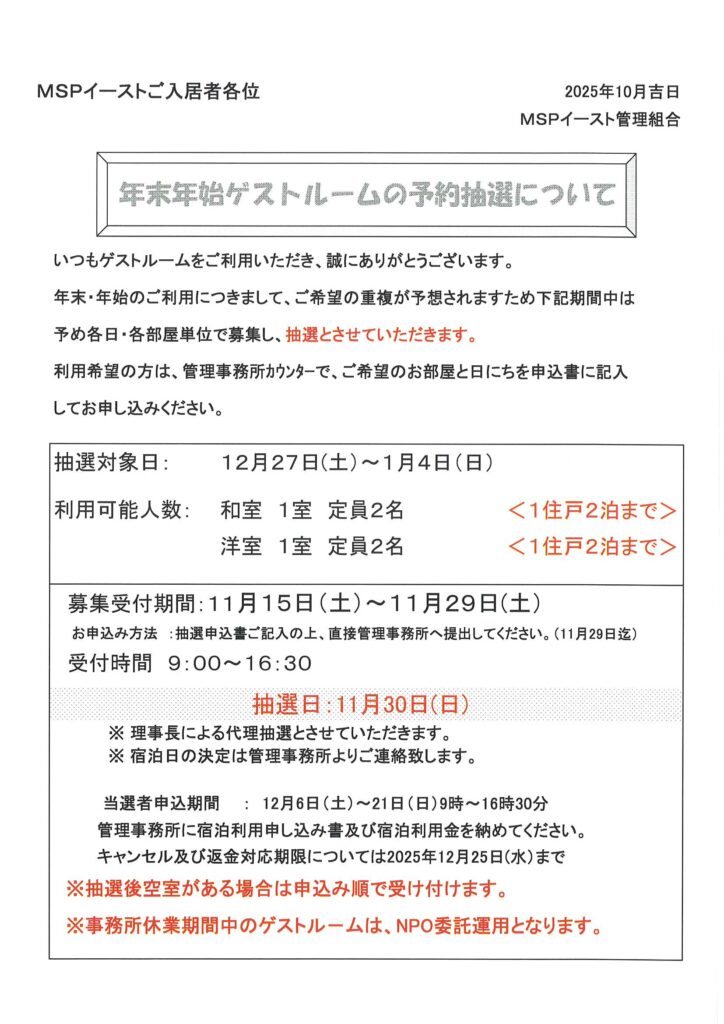 年末年始ゲストルームの予約抽選について