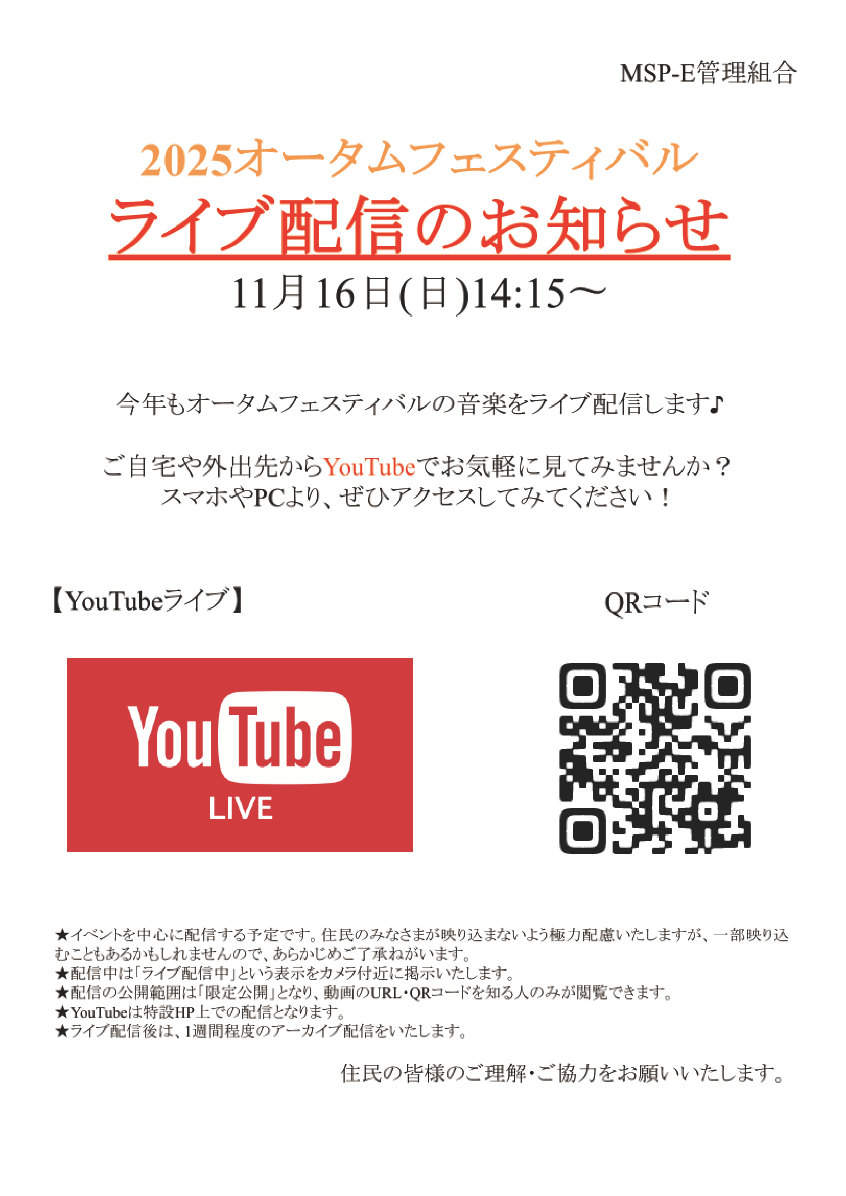 住民ページ > お知らせ掲示板 > 住民-お知らせ > 2025オータムフェスティバル・ライブ配信のお知らせ