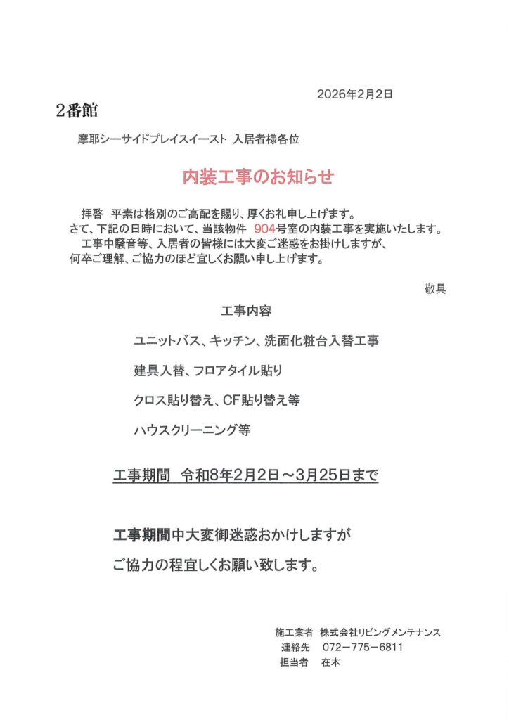 [2番館]リフォーム工事のお知らせ