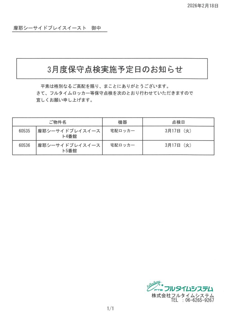 【4・5番館】宅配ロッカー保守点検のお知らせ