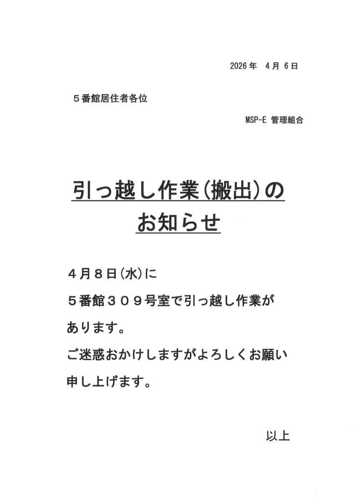 住民ページ > お知らせ掲示板 > 住民-お知らせ > [5番館]引っ越し作業のお知らせ