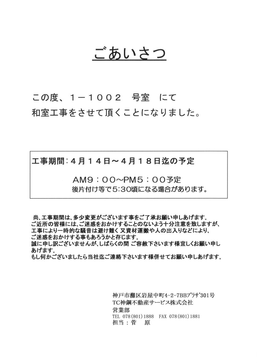 [1番館]リフォーム工事のお知らせ