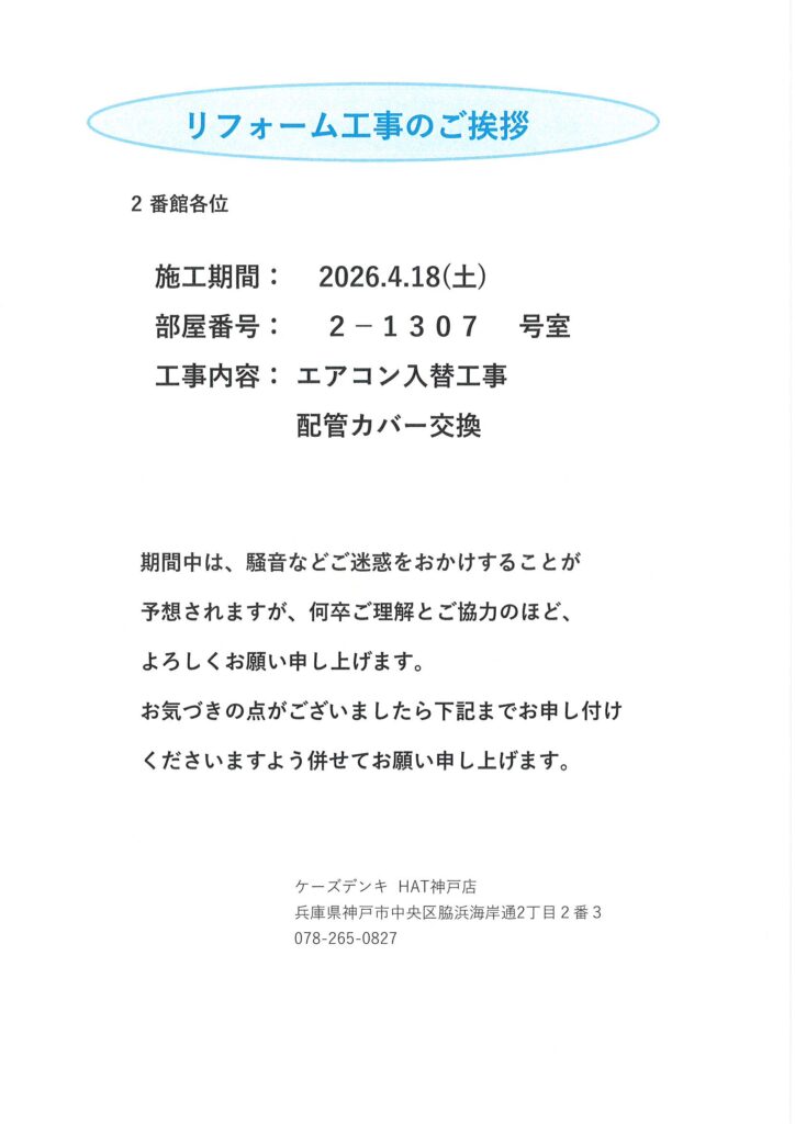 [2番館]リフォーム工事のお知らせ