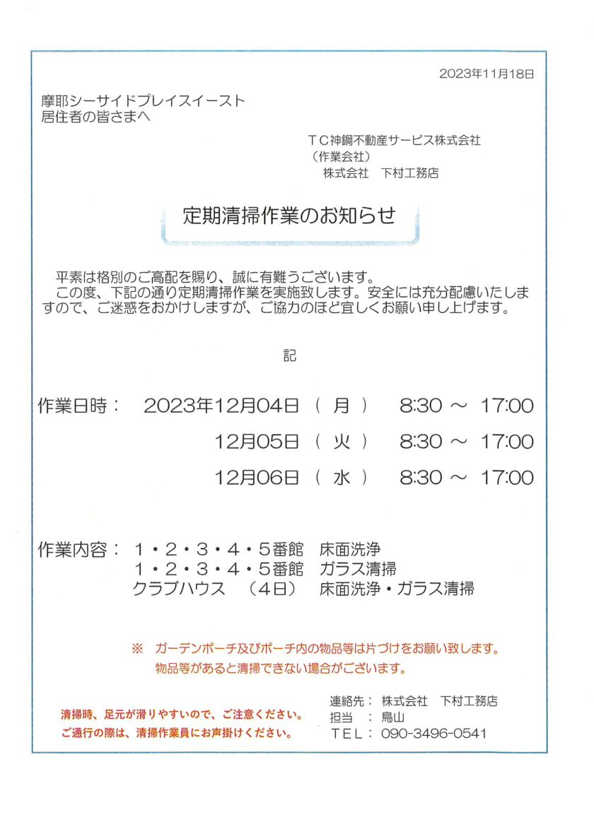 定期清掃作業のお知らせ12/4~12/6