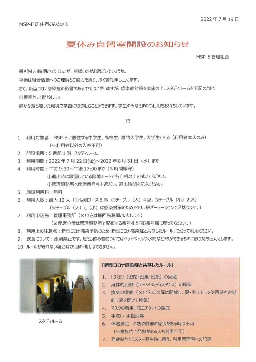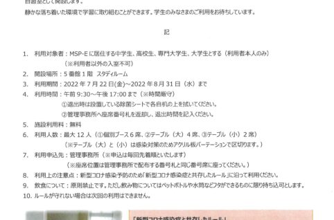 夏休み自習室開設のお知らせ