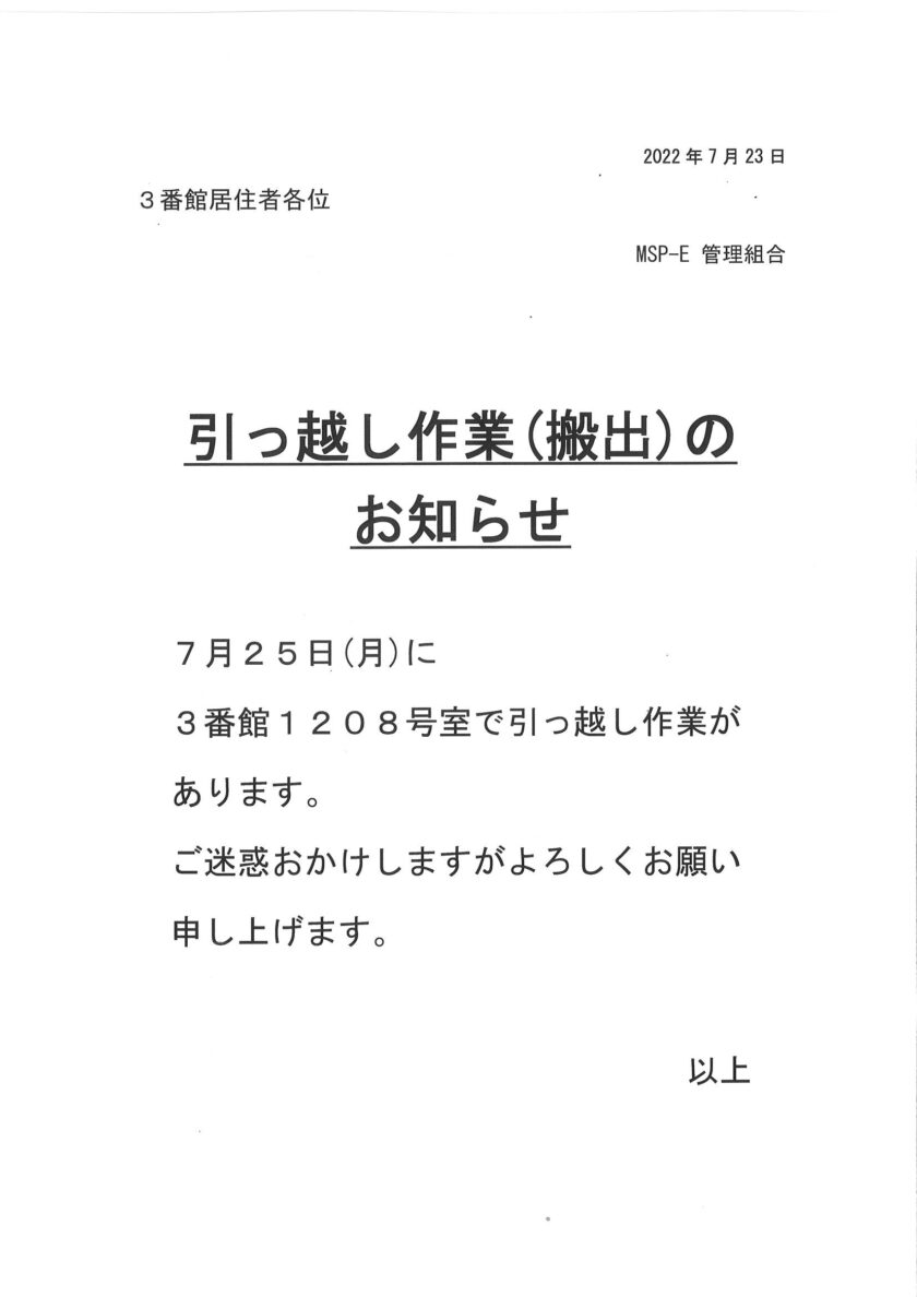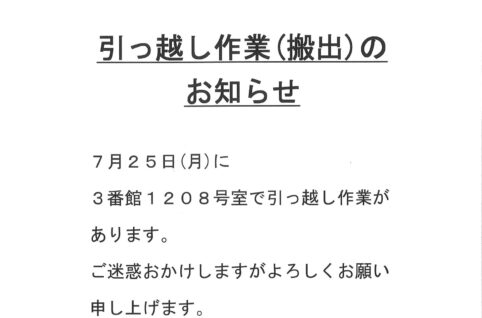 [3番館]引っ越し作業(搬出)のお知らせ