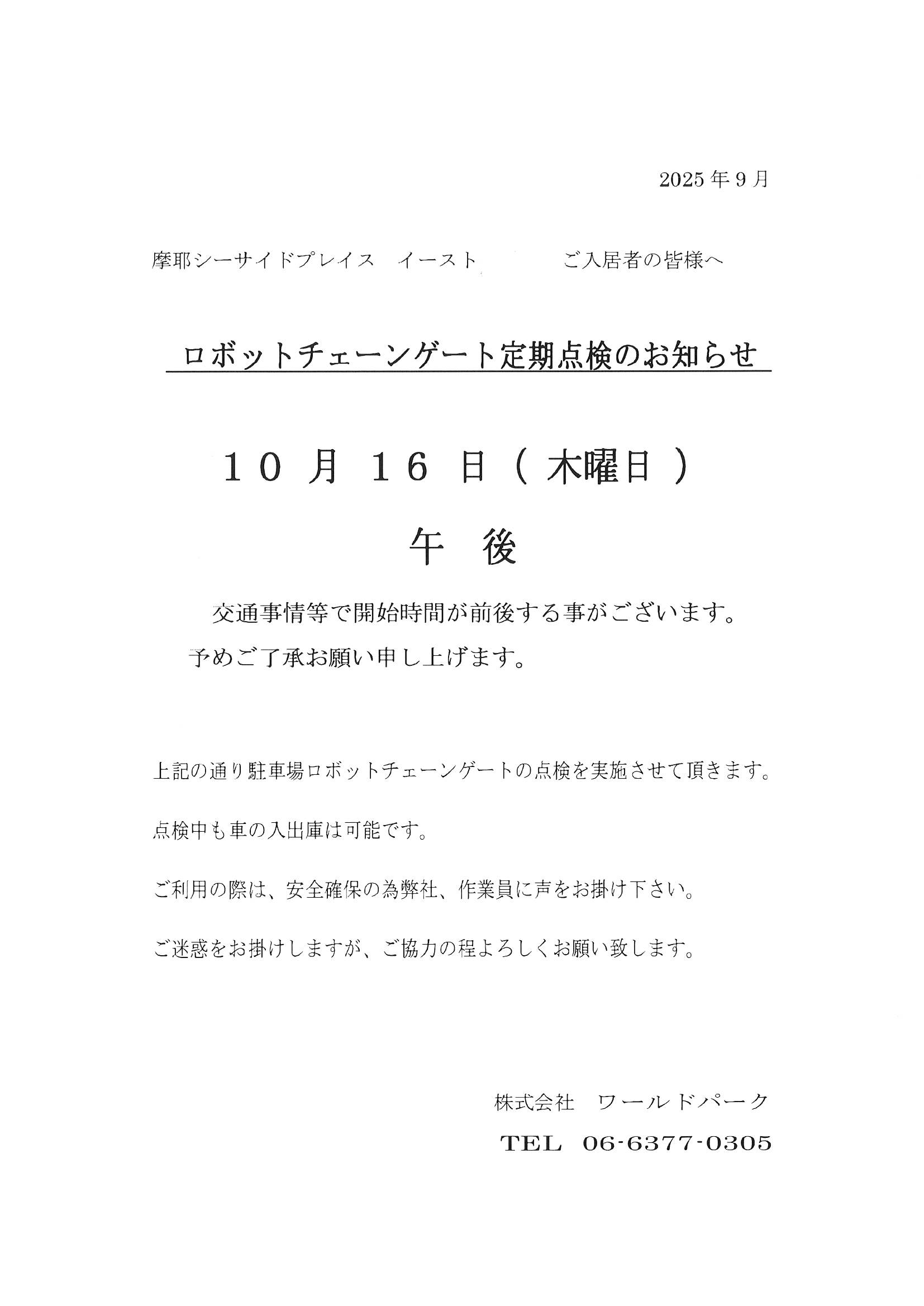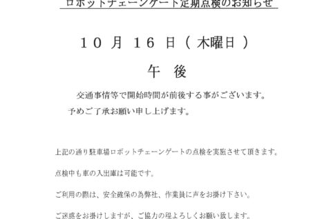 10月16日(木)午後 ロボットチェーンゲート定期点検のお知らせ