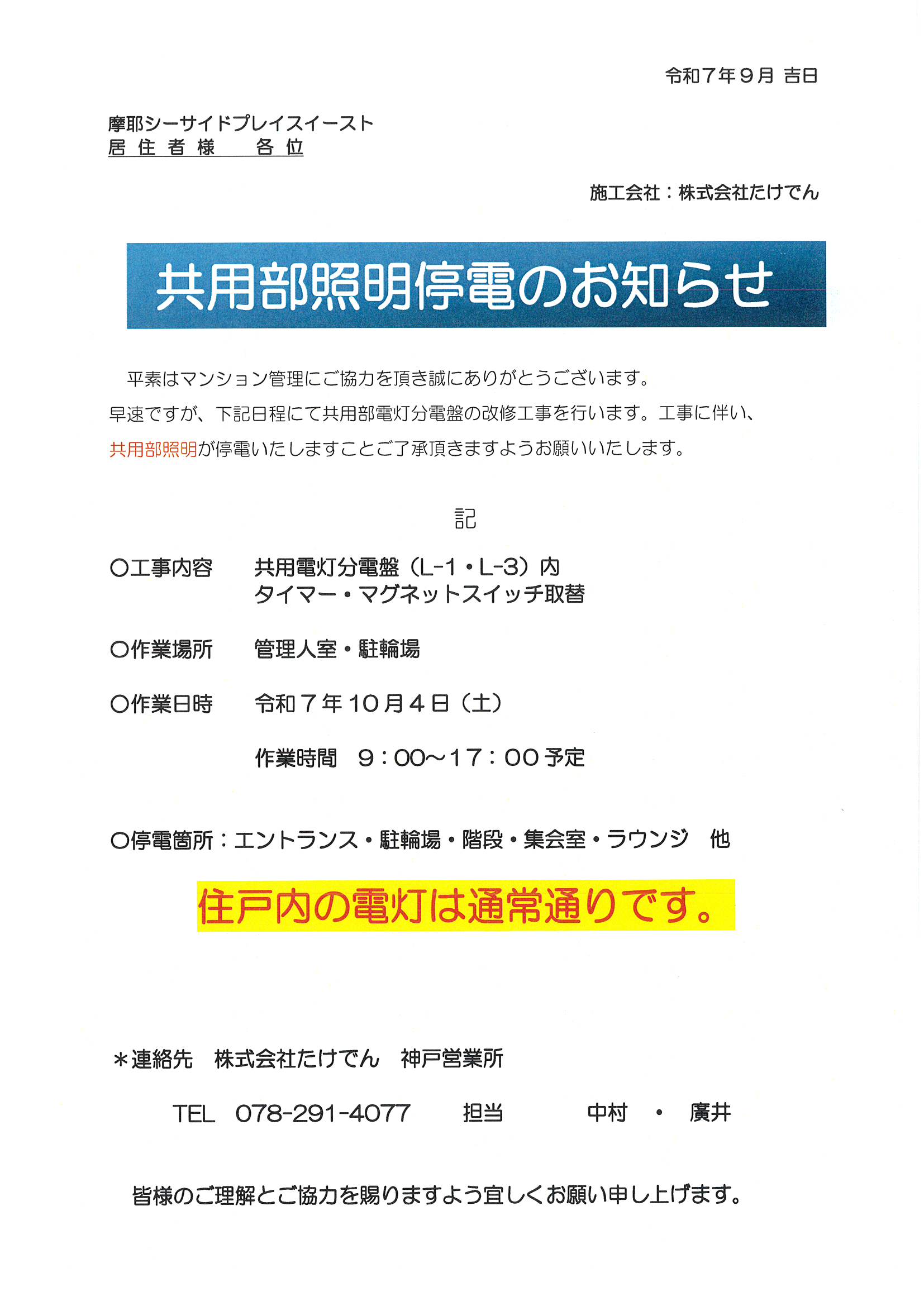 共用部照明停電のお知らせ